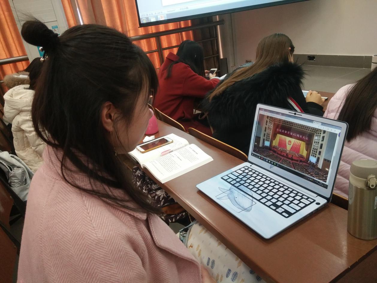 当《春天的故事》的歌声响起时,国家重要领导人为改革开放的先锋颁奖。同学们也不由得肃然起敬。直播结束,现场同学们一起交流和分享各自的观看心得。