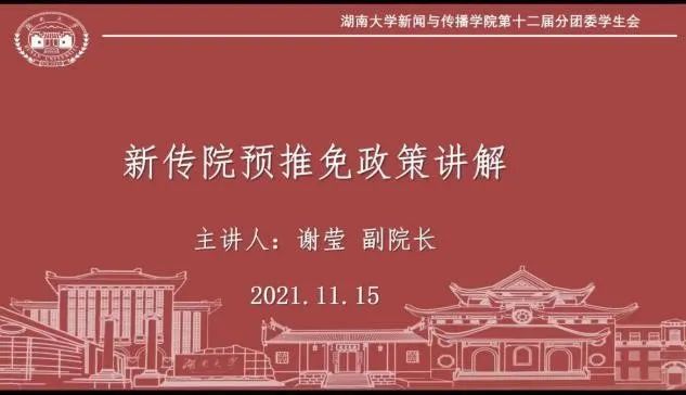 副院长谢莹担任主讲,院团委书记、本科2019级辅导员杨湘雨老师出席。讲座由学生会学习部组织,旨在帮助低年级同学明确推免相关要求,解答同学们对于推免政策的疑惑。