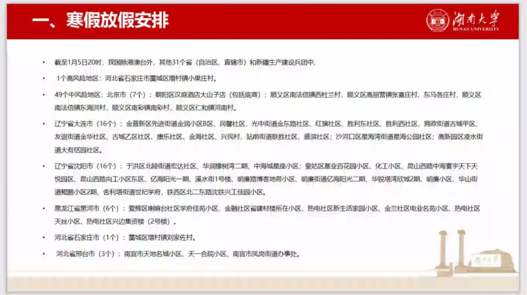 ,还是寒假期间,都应增强防护意识,落实防控措施;坚持打卡,少流动,少聚集,在人群密集、封闭拥挤的场所,仍要坚持佩戴口罩,除毕业实习外减少不必要外出,在外地实习也要定期消毒,定期清洁。