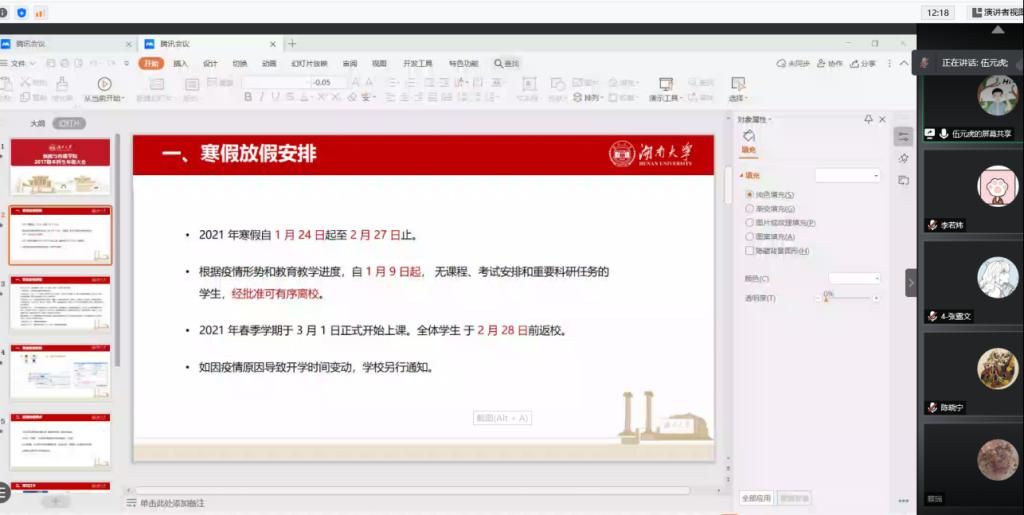 2017级年级大会在线上顺利召开。此次会议中,辅导员伍元虎老师对寒假放假安排、疫情防控工作要求及毕业相关事项进行了解说,并就同学们近期反映较多的问题进行了统一解答。