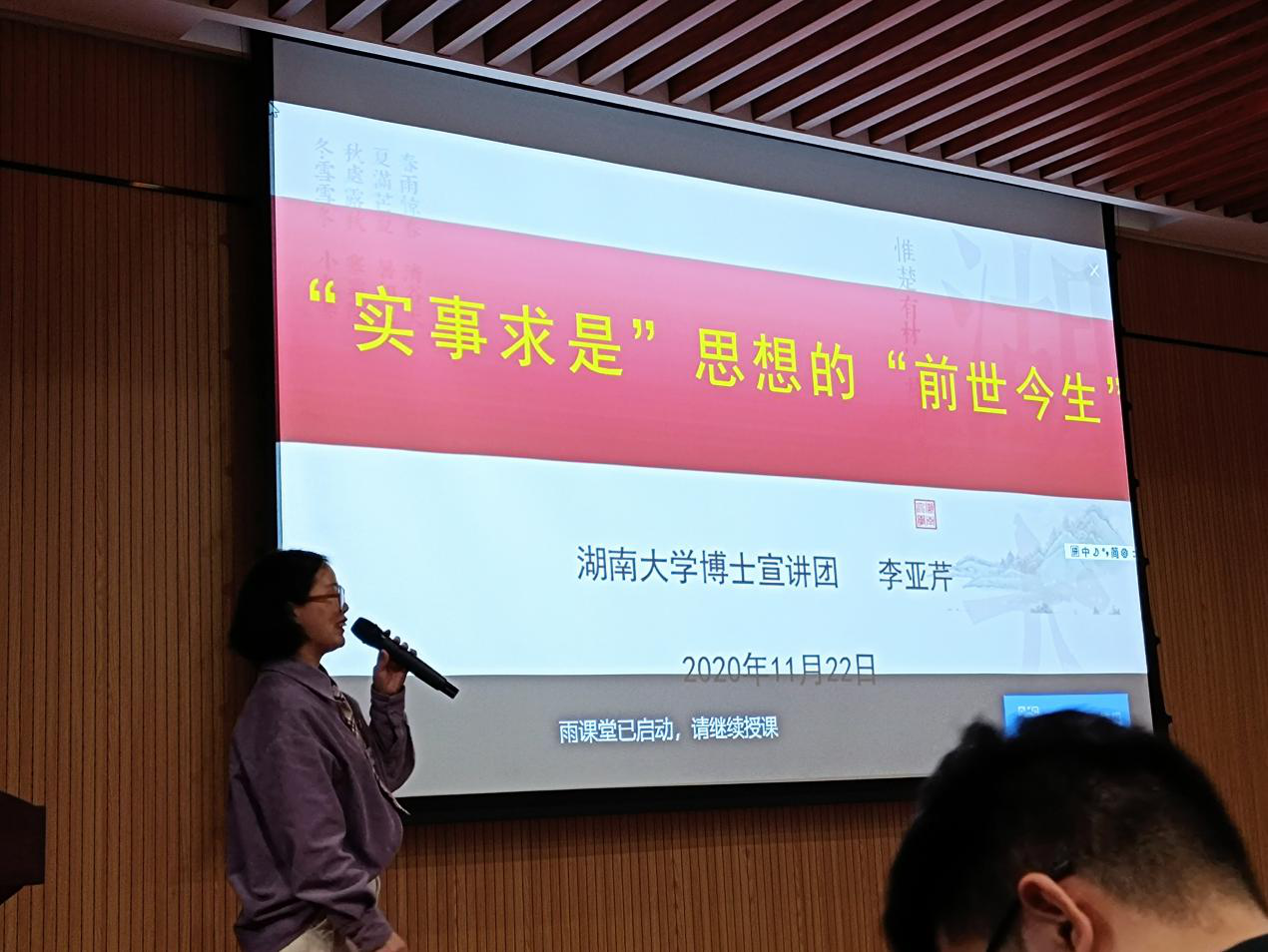 谈到实事求是时,李亚芹博士从一支99年前的中国创业团队从零开始,打败了西方跨国公司对手说起,引出实事求是对中国共产党的意义,介绍“实事求是”思想的前世今生。“实事求是”与马克思主义的碰撞表明了它作为一种思想武器对共产党员的深刻影响,李博士的讲解中,还用“长征”、经济特区的建立为例证明了它还是一种战略,具有客观性与实用性。习近平总书记对于扶贫的实地考察,更是“实事求是”这一思想的活态传承与生动示范。实事求是作为湖大校训,更应该在湖大学生今后的人生路途中发挥重要的指导性作用。