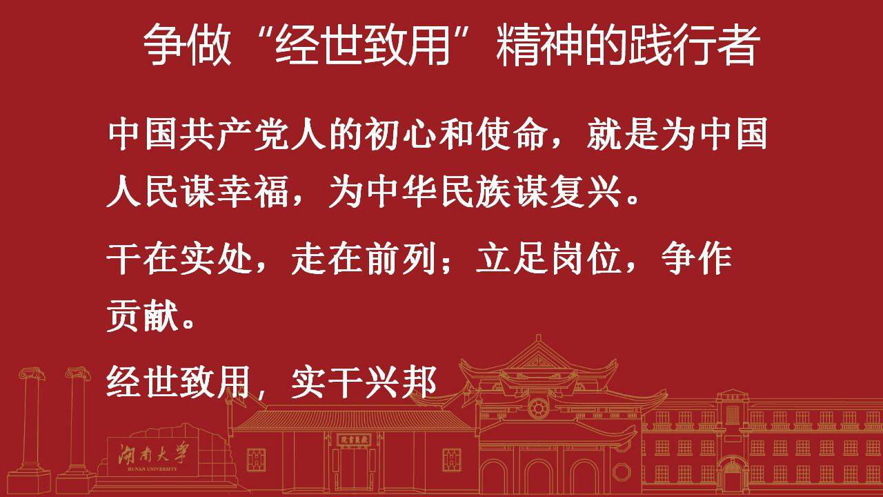 训的一脉相传。王博士特别强调“经世致用”精神的传承,“经世”是为治理世事,“致用”是为尽其所用。深入理解“经世致用”,它要求青年具有传道济民的责任担当,要修炼立已达人的修身德性,更要培养心忧天下的家国情怀,做“经世致用”精神的践行者。