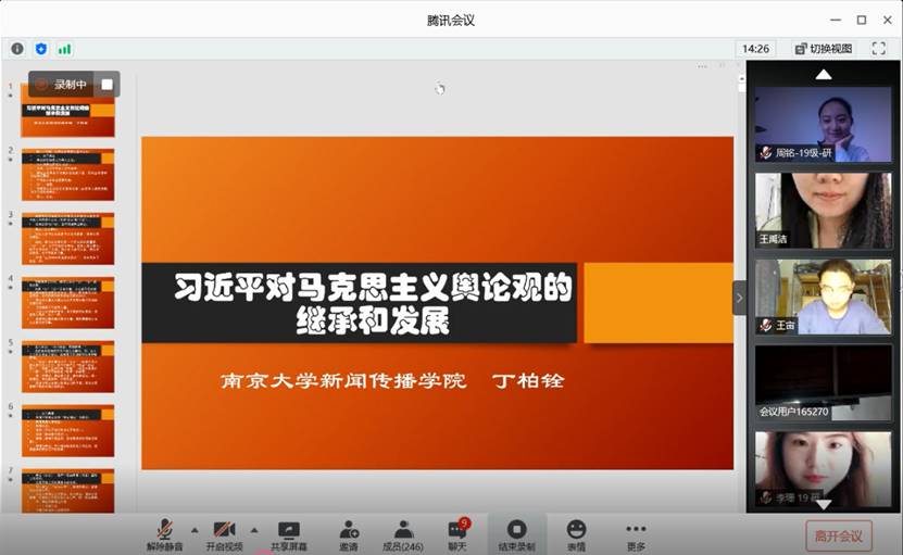 马克思主义新闻观研究中心于“云端”腾讯会议室举办了新学期的第一场岳麓传媒论坛马克思主义新闻观主题系列讲座。此次学术讲座以“习近平总书记对中国共产党舆论观的继承和发展”为主题,由南京大学新闻传播捕鱼大作战