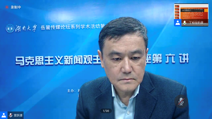 教授、博士生导师丁柏铨担任主讲嘉宾,新传院特聘教授、岳麓学者雷跃捷担任主持人,校内外师生200余人参与。