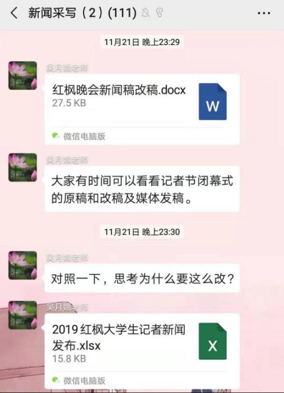 主办的第六届红枫大学生记者节结束后,2017级新闻班的何思妍也收到了吴老师的指导和鼓励。“当时我正在刷手机,突然就收到了吴老师的消息”,起初,还“吓了一跳”,交流之后才明白吴老师的用心。原来,此前何思妍个人认为还不错的作品,这次在记者节上连优秀奖都没评上的。记者节获奖结果公布后,吴老师一一分析了未获奖的优稿,并与学生作者仔细分析原因。