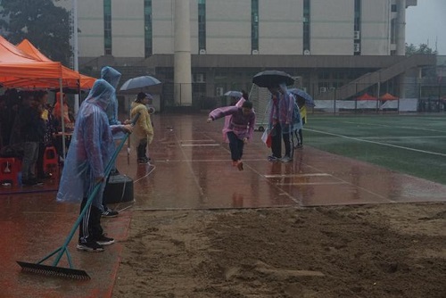 女子三级跳远比赛决赛中,尽管雨下得很大,比赛难度有所加大,但我院赖禹蓉表现出了极佳水平。经过几轮的激烈角逐,最终她以6.86米的成绩夺得了小组第六名的好成绩。当提及自己的成绩,赖同学说道:“ 我对自己的成绩还比较满意,因为自己之前也没跳过三级跳,训练也不是很充足,而且今天穿着雨衣活动比较受影响,不过不管怎么说取得了这样的成绩还是要感谢教练对自己的指导。”