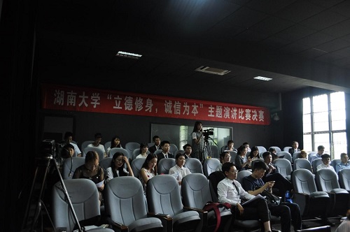 的21名选手齐聚新影院,给大家带来了一场听觉的盛宴。比赛中,湖大学子们尽情地发挥自己的想象力和创造力,独特的视角和严谨的逻辑阐述“立德修身,诚信为本”。有的同学借古人之言,向大家讲述诚信是中华民族的传统美德;有的同学结合自己的亲身经历,将诚信与母校培养教育联系在一起,把母校对自己的诚信教育展示出来,既表达了对母校的热爱之情,又升华了主题;有的同学以最近发生的社会热点与时事作为切入点,引起大家共鸣的同时也调动了现场观众的热情。
