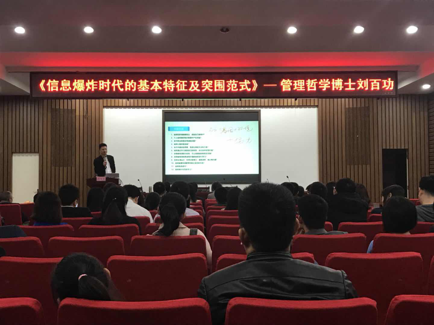 教学北楼217学术报告厅举行“信息爆炸时代的基本特征及突围范式”讲座。讲座有幸邀请到管理哲学博士刘百功先生为同学们分享他的学习之道。