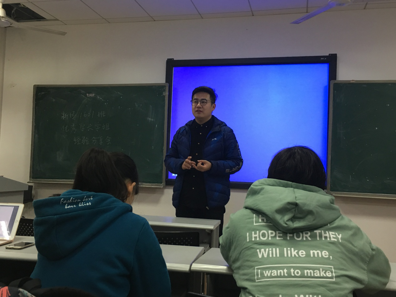 新传1601班在综合楼开展优秀学长学姐经验分享会。会上,同学们热情高涨,争相向学长学姐请教。