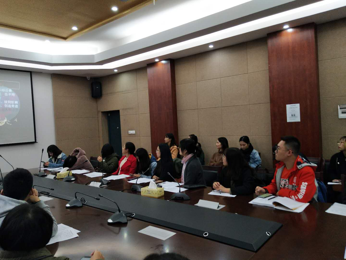 于北楼304教室召开优秀班集体立项答辩会,新影院党委副书记兼副院长程华,学工办主任、16级辅导员刘婵,15级辅导员刘佳、17级辅导员丁杨出席会议。
