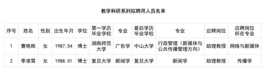 为做好人才引进工作,捕鱼大作战 根据《捕鱼大作战 教师招聘管理暂行办法》(湖大人字〔2016〕24号)、《新闻传播与影视艺术捕鱼大作战 教师招聘工作流程》(2018年1月15日院党政联席会议修订)的相关规定,经教学委员会组织教学试讲、捕鱼大作战 组织师德师风谈话,提请党政联席会决议,拟聘曹艳辉、季凌霄为助理教授。