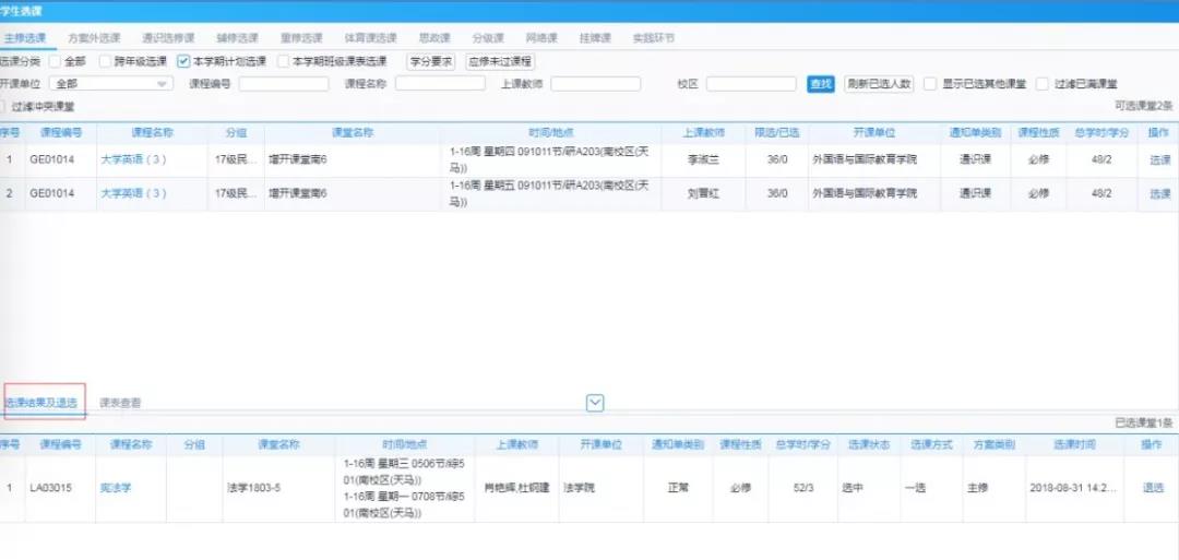 注意事项:方案外课程由于数据量较大,默认不加载待选课程。需要通过课程名称查询出该课程的可选课堂。